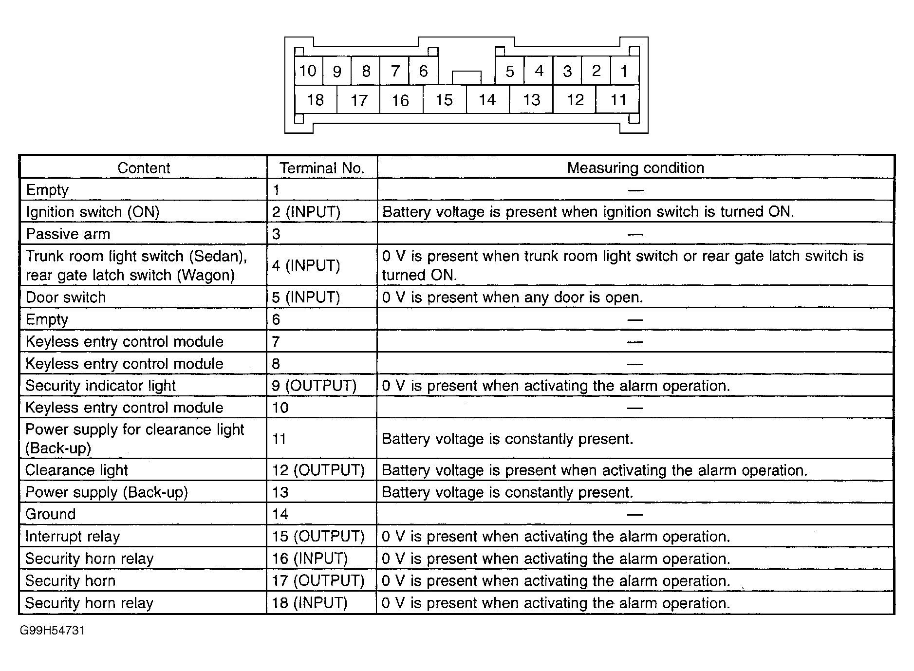- Check resistance between ground and security control module harness connector terminal No. 14. If resistance is less than 10 ohms, perform BASIC DIAGNOSTIC PROCEDURES (ANTI-THEFT/SECURITY SYSTEM) . If resistance is not less than 10 ohms, repair circuit between security control module and ground.