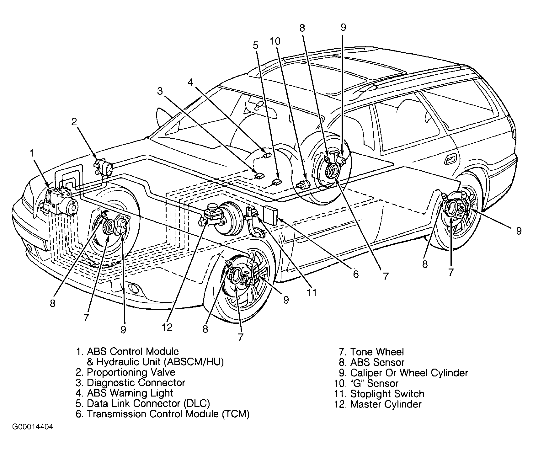 Anti-Lock Brake System (ABS) is designed to prevent wheel lock-up during heavy braking. ABS electronically controls brake fluid pressure, reducing chance of wheel lock-up. This allows driver to maintain better steering control of vehicle. Major components of ABS system are 4 wheel speed sensors, 4 tone wheels, ABSCM/HU, "G" sensor and ABS warning light. See Fig 1.