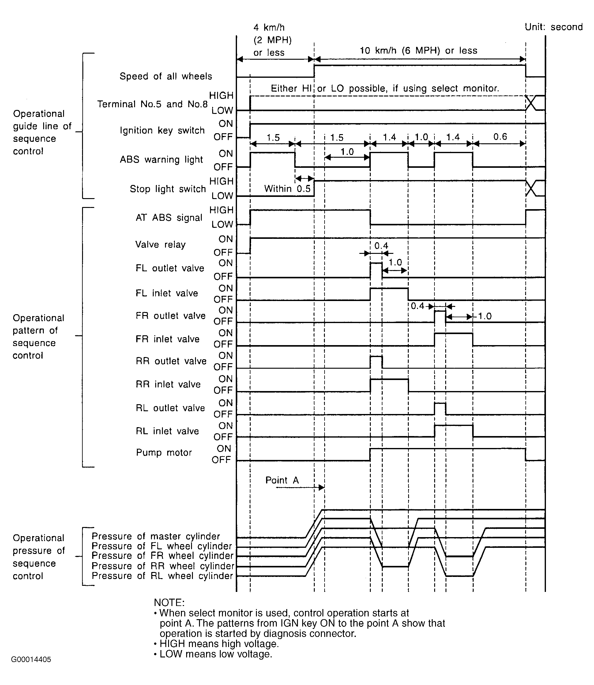 - Remove front caliper bleeder screws. Connect brake pressure gauges to calipers and bleed system. Connect diagnostic terminals to diagnosis connector terminals No. 5 and No. 8. Set front or rear wheels on brake tester with vehicle in Neutral. Operate brake tester according to manufacturer's instructions. Set wheel speed at 2 MPH (4 km/h) or less. Turn ignition on. ABS warning light should illuminate for 1.5 seconds. Within .5 second after ABS warning light goes out, depress brake pedal. Hydraulic unit should now begin to operate. See Fig 1.