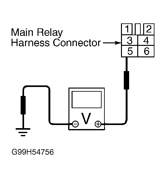 Reconnect main relay. Disconnect main relay harness connector. Turn ignition on. Using DVOM, check voltage between main relay connector terminals Nos. 2, 5 and 6 and chassis ground. See Fig 2. Voltage reading on each listed terminal should be greater than 10 volts. If voltage reading is as specified, go to next step. If voltage reading is not as specified, check and repair power circuit to main relay harness connector. See appropriate wiring diagram in WIRING DIAGRAMS article. - Check Main Relay Ground Circuit