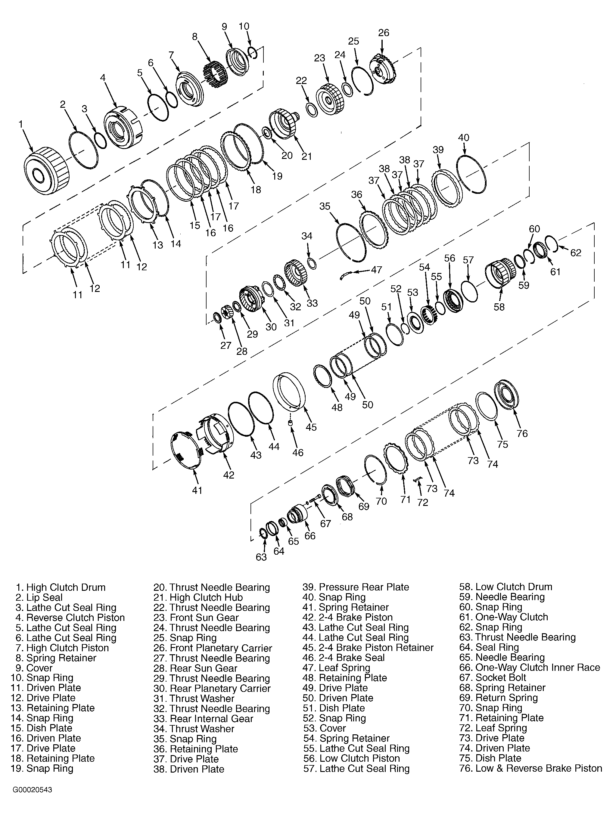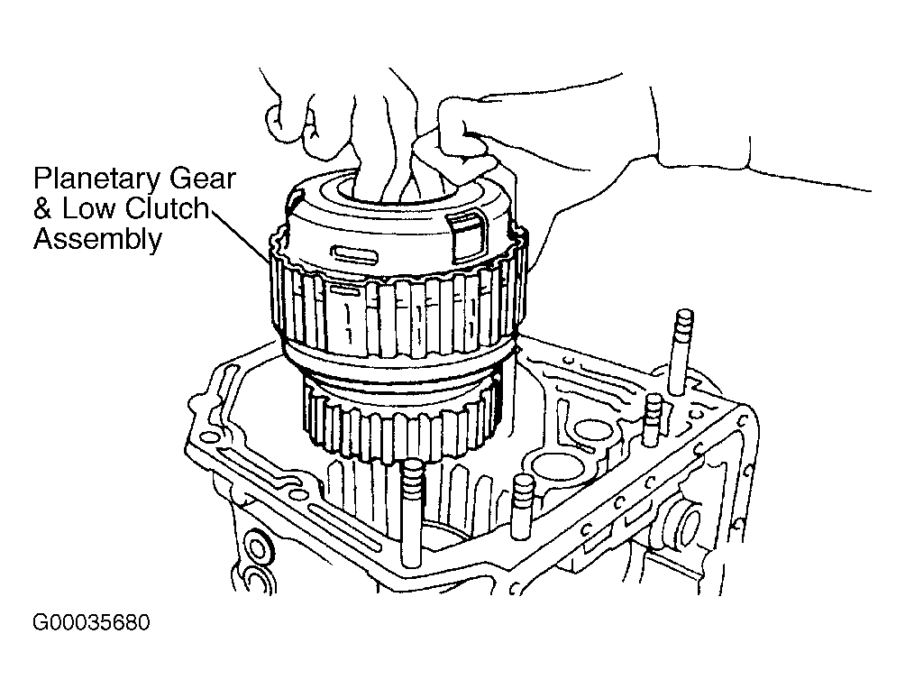 - Remove 2-4 brake retaining plate, drive plates, driven plates and rear pressure plate. Remove thrust needle bearing, planetary gear assembly and low clutch assembly. See Fig 2 . Remove snap ring retaining 2-4 brake return spring assembly and remove return spring. Remove 2-4 brake piston and piston retainer. Remove low and reverse brake leaf spring from transaxle case. DO NOT bend leaf spring when removing.