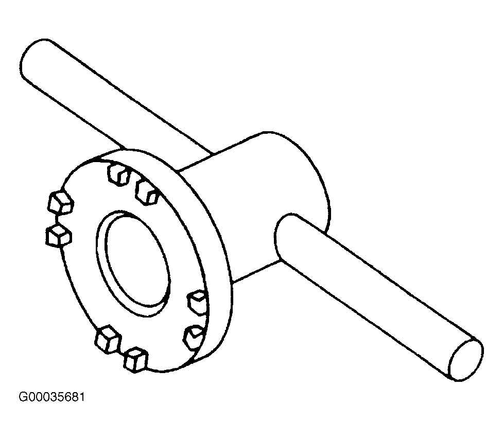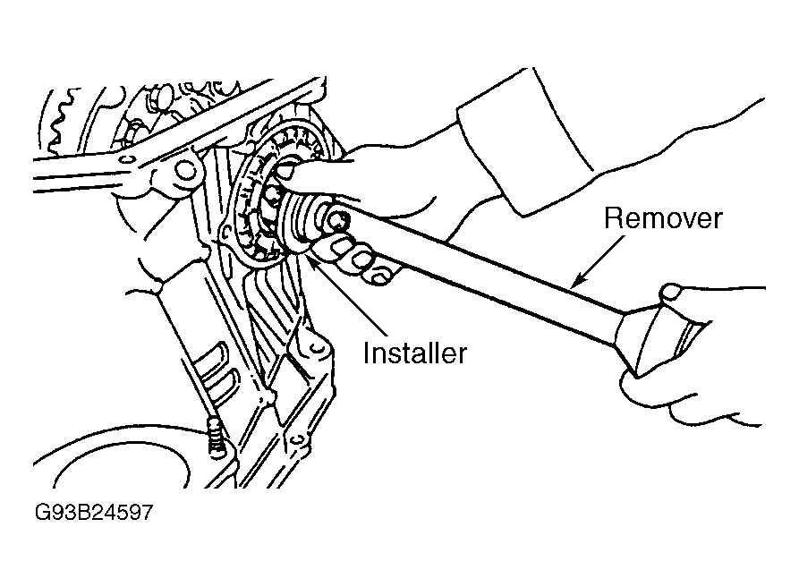 - Wrap left and right axle shafts with tape. Remove differential side retainers using Wrench (499787000). See Fig 3 . Hold differential case assembly by hand to avoid damaging retainer mounting hole of torque converter case. Remove axle shafts using Special Tools (499095500) and (499247300). See Fig 4 . Remove and discard axle shaft circlips.