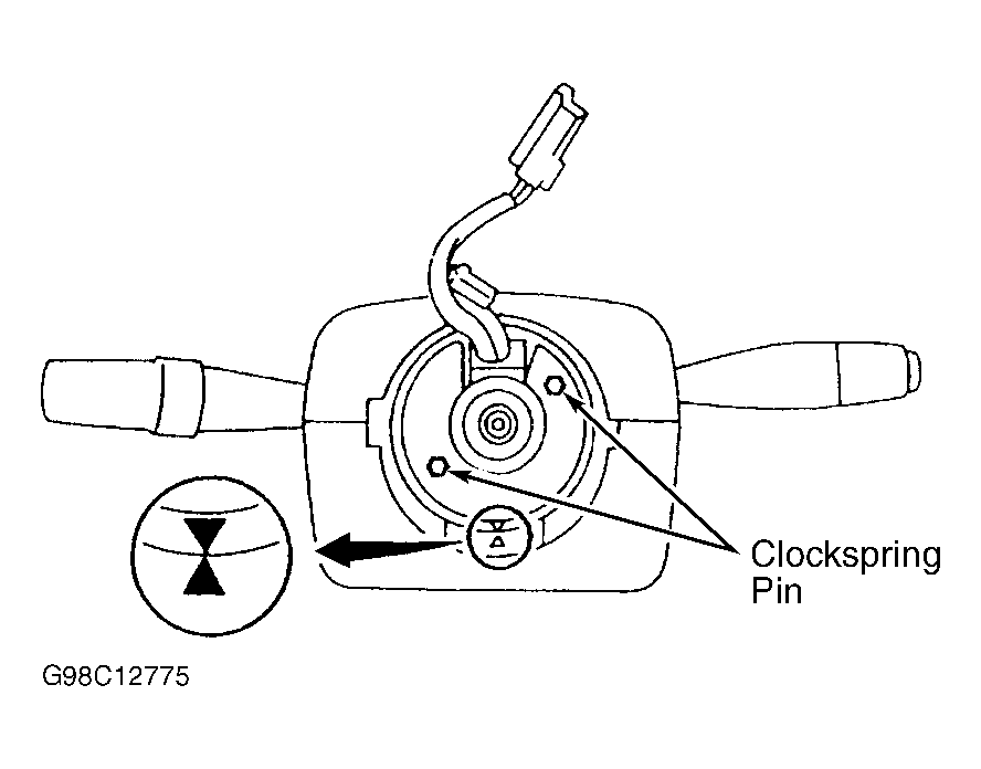 Ensure wheels are in a straight-ahead position. With air bag module and steering wheel removed, turn clockspring pin clockwise until it stops. See Fig 1 . Then turn clockspring pin counterclockwise approximately 2.65 turns until the word CENTER appears in indicator. Align arrow marks. See Fig 1 . Clockspring is now centered. Install steering wheel and air bag module. Turn steering wheel fully in both directions to ensure steering is normal.