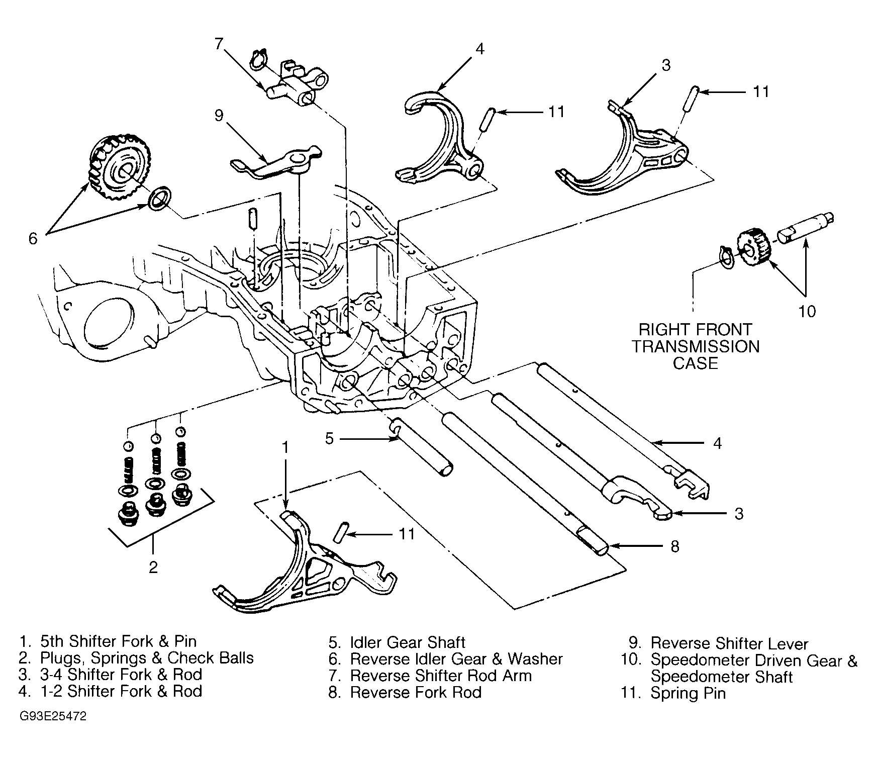 - Drive out spring pin to remove 5th shifter fork. Remove plugs, springs and check balls. Drive out spring pins. Remove 3rd-4th fork rod and shifter fork (keeping other rods in Neutral position), 1st-2nd fork rod and shifter fork. Remove idler gear shaft, reverse idler gear and washer. See Fig 2.