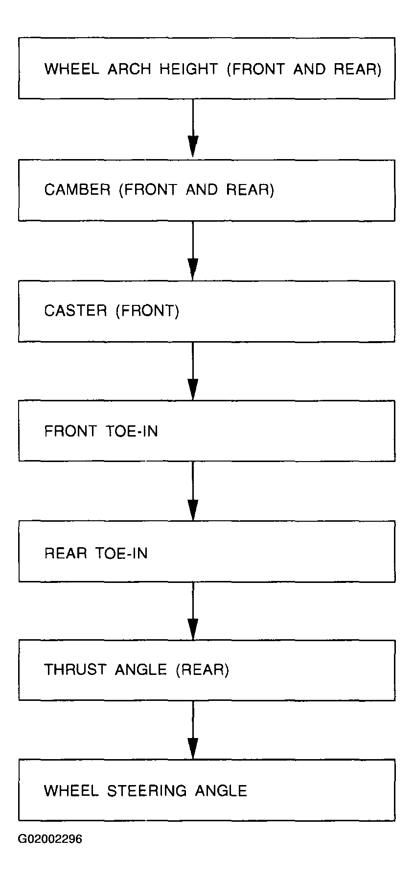 Check, adjust and/or measure wheel alignment in accordance with procedures indicated in figure. See Fig 1 .