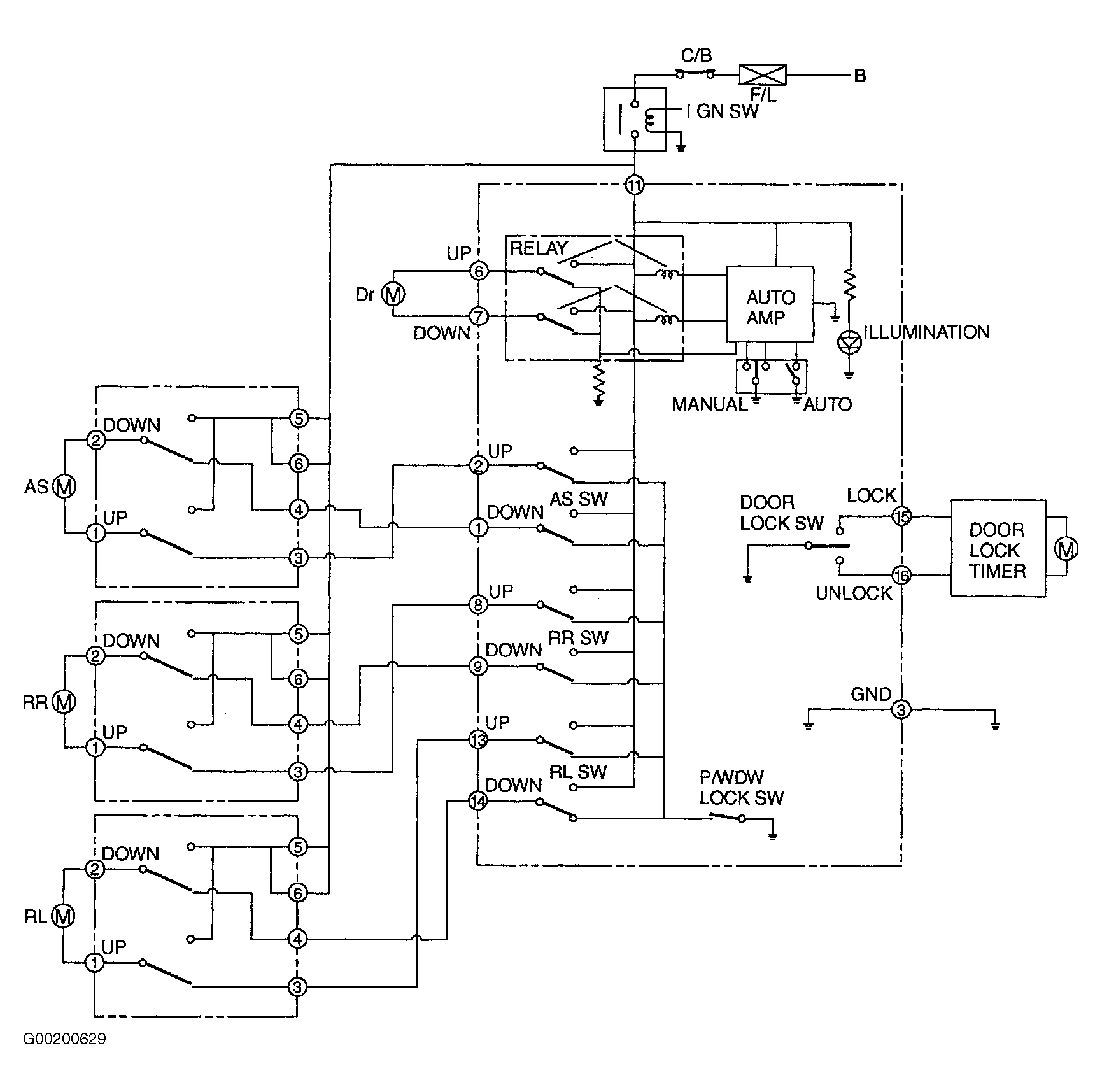 The power window system consists of regulator motors and switches for individual doors, relays, and a circuit breaker unit. Each door window opens/closes by pushing down/pulling up on the switch. Only the driver's door window switch has a 2-stage mechanism. When the switch is pushed lightly and held in the pushed position, the window continues to lower until the switch is released. When the switch is pushed down fully, the window lowers to the end position automatically. See Figure for the circuit diagram.