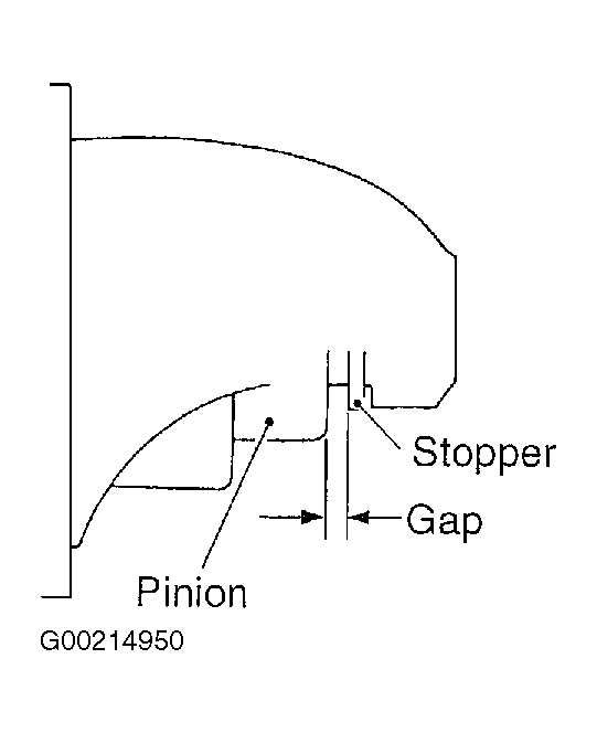 2. If the pinion gap is outside specified range, remove or add number of adjustment washers used on the mounting surface of switch assembly until correct pinion gap is obtained.
