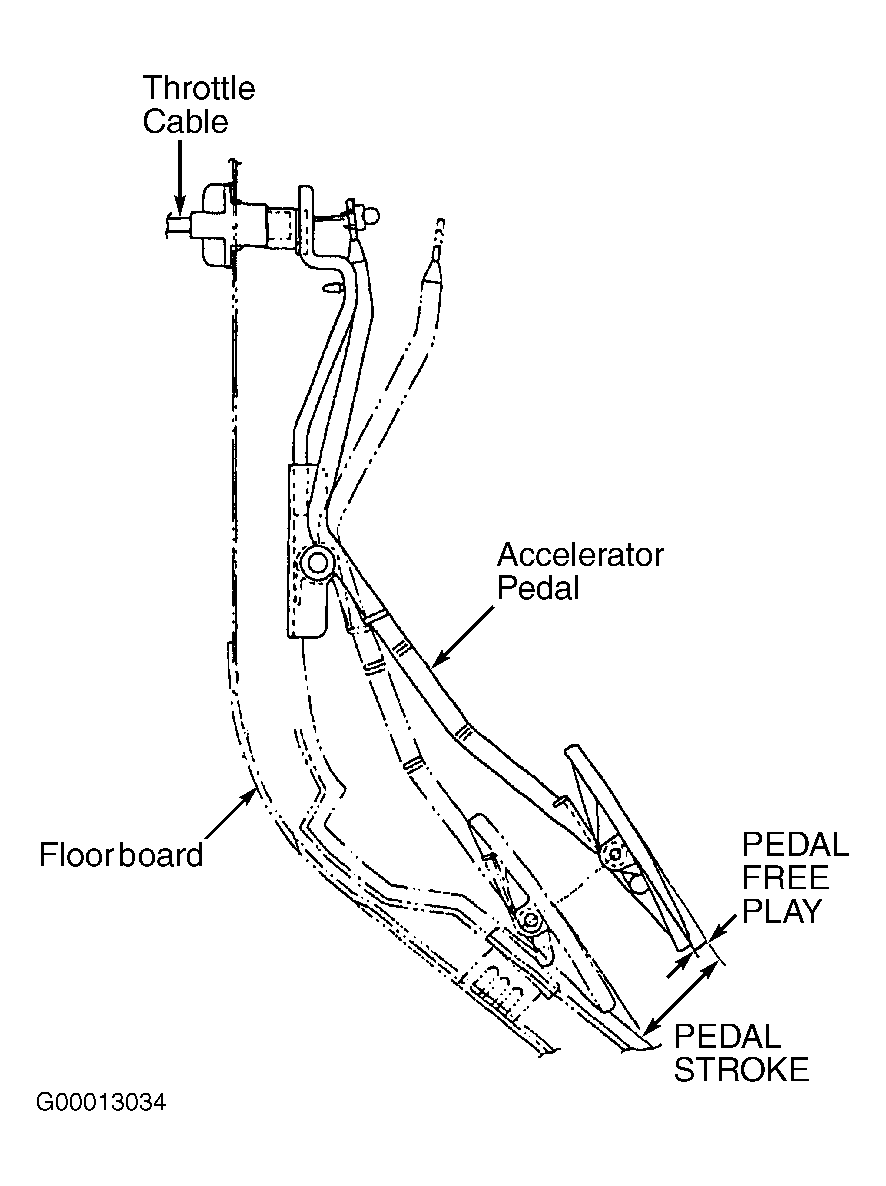 Check throttle cable free play by operating accelerator pedal by hand. If pedal free play is not .04-.16" (1-4 mm) for 2.0L, 2.5L and 3.0L or pedal stroke is not 2.05-2.24" (52-55 mm) for 2.0L and 2.5L or 1.97-2.17" (50-55 mm) for 3.0L, adjust to specification by turning nut connecting throttle cable to throttle body. See Fig 1 .