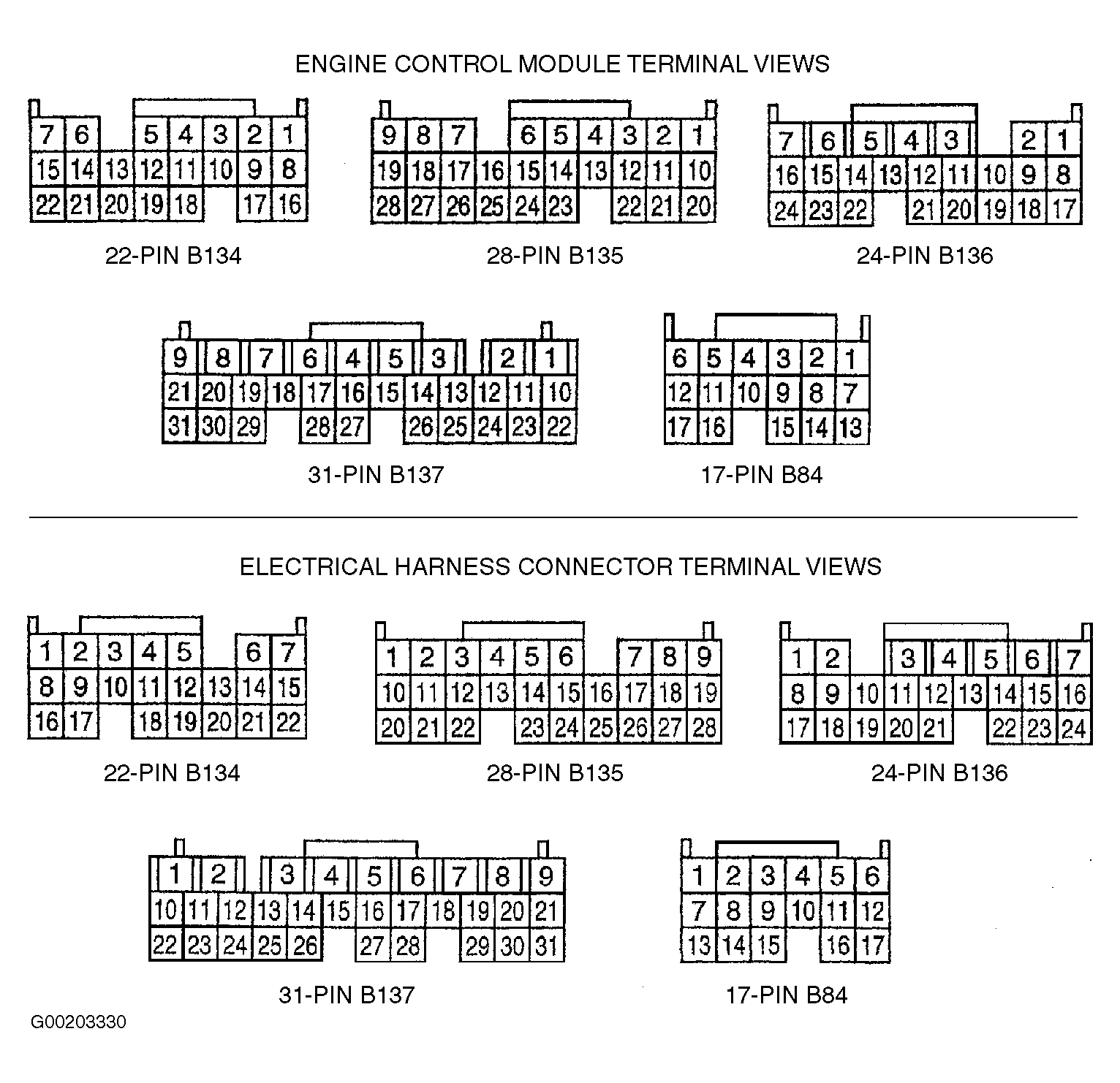 ECM Harness Connector & Terminal No. ECM Harness Connector Wire Color Fuel Injector No. (1) Fuel Injector Harness Connector Terminal No. 1 Wire Color 31-Pin B137 1 Pink 1 Green/White 24-Pin B136 6 Pink/Blue 2 Blue/White 5 Pink/Black 3 White 4 Pink/Green 4 Yellow/White (1) Wire changes color at Brown 16-pin connector located at left front corner of engine compartment in front of main fuse box.