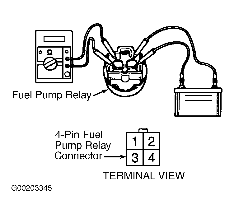 6. Remove fuel pump relay. Using jumper wires, connect battery voltage to fuel pump relay terminal No. 1 and ground terminal No. 3. Measure resistance between fuel pump relay terminals No. 2 and 4. See Figure . If resistance is less than 10 ohms, go to next step. If resistance is not less than 10 ohms, replace fuel pump relay.