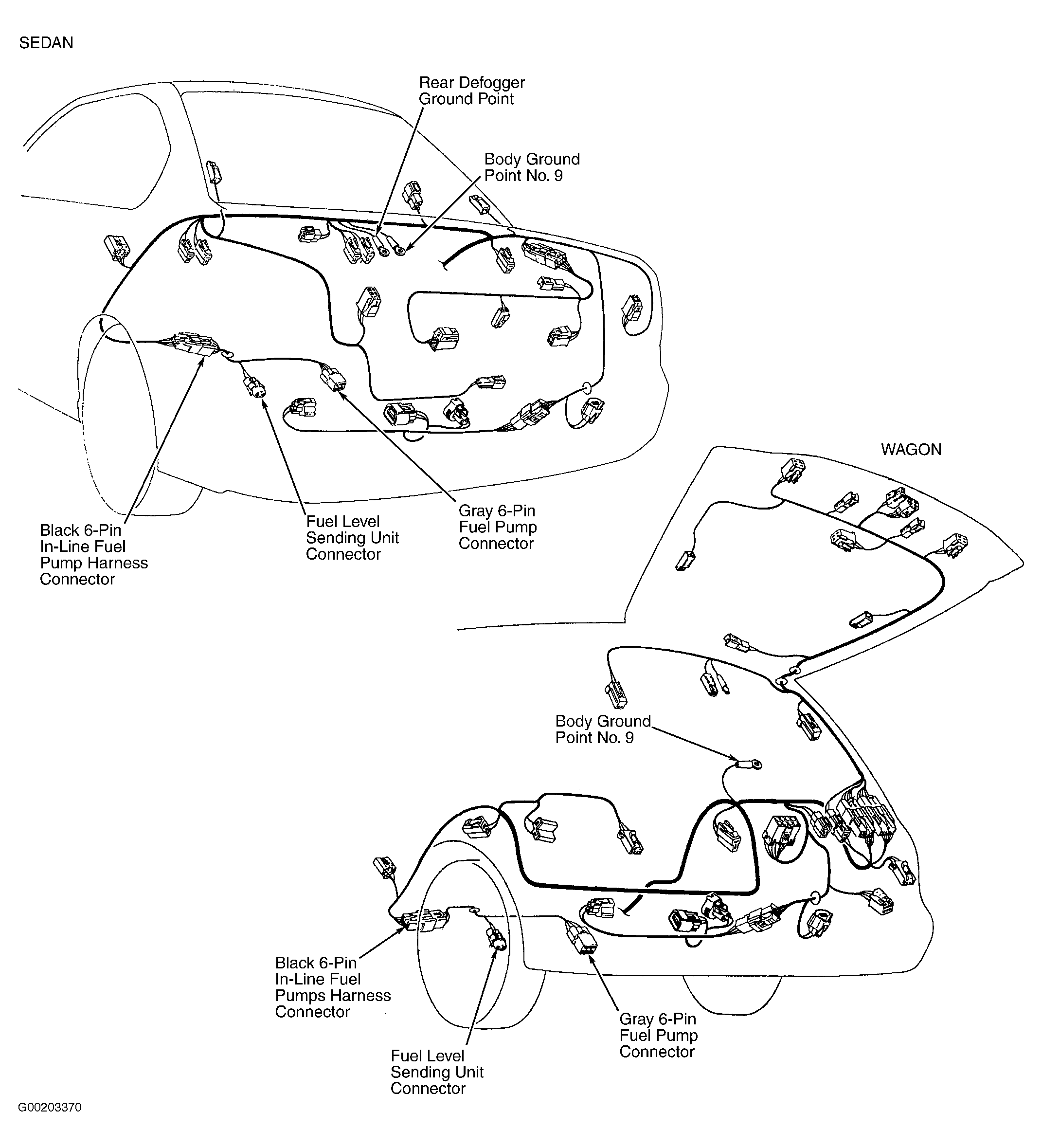 NOTE: Subaru did not provide wire colors for the 6-pin connector at the fuel pump. The following tests are to be performed at Black 6-pin in-line fuel pump harness connector. For location of in-line connector, see Fig 1 .