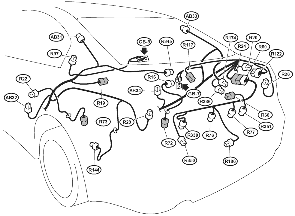 Keyless Entry Control Module (Sedan) (R345) Center front of luggage compartment. See Figure.