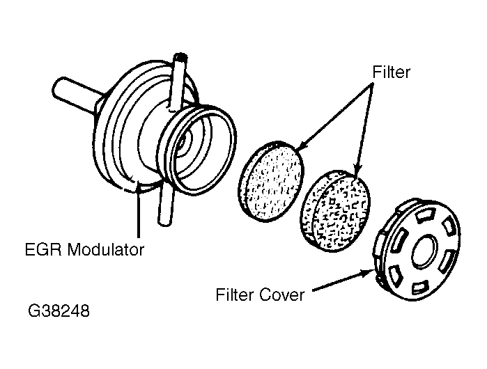 1. Disconnect modulator hoses and remove modulator. Check modulator filter for contamination or damage. Using compressed air, clean filter. Reinstall filter. Plug one of the side nozzles with a finger while blowing air into the nozzle on the other side. Check that air escapes from the air filter side of the modulator. See Fig 1 .