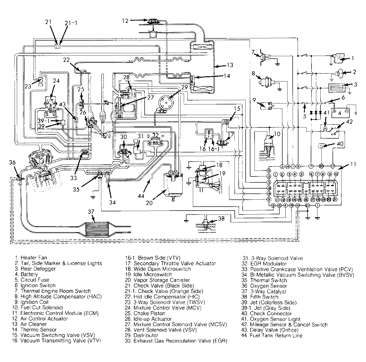 The computer controlled emission system uses sensors located throughout the vehicle to collect information. This information is fed to an ECM. The ECM uses the information to correctly adjust the pulse air control, fuel-cut, idle-up and bowl vent systems, EGR system and secondary throttle system, as well as feedback system. The ECM is located behind the glove box.