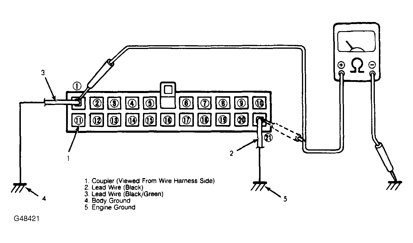 2. Attach ohmmeter between terminal No. 1 (harness side) and ground. See Figure . Note ohmmeter reading. Repeat procedure for terminal No. 21 and note ohmmeter reading. If ohmmeter reading at both terminals is zero, ground system is secure.