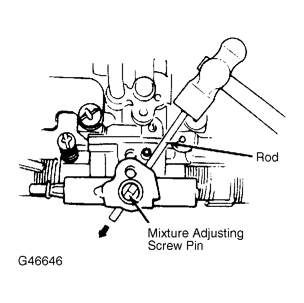 - Drive out idle mixture adjusting screw retaining pin with a .18" (4.5 mm) rod to gain access to mixture adjusting screw. See Fig 2 . Install carburetor.