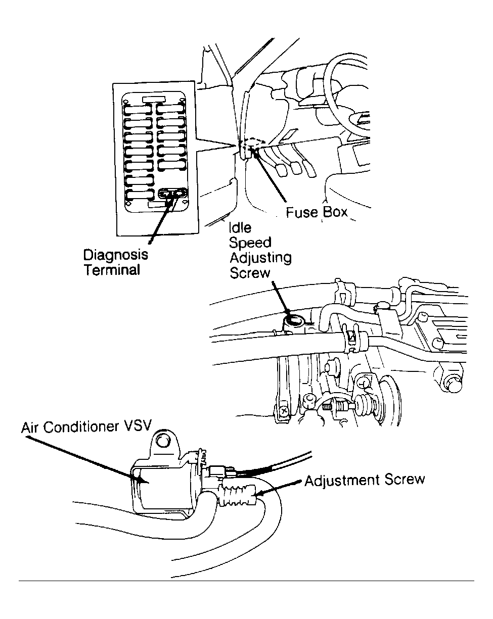 - On vehicles equipped with A/C, turn switch on and set heater blower switch to the low position. With A/C operating correctly, verify idle is 850-950 RPM. If adjustment is required, turn A/C Vacuum Solenoid Valve (VSV) adjustment screw to obtain correct idle.