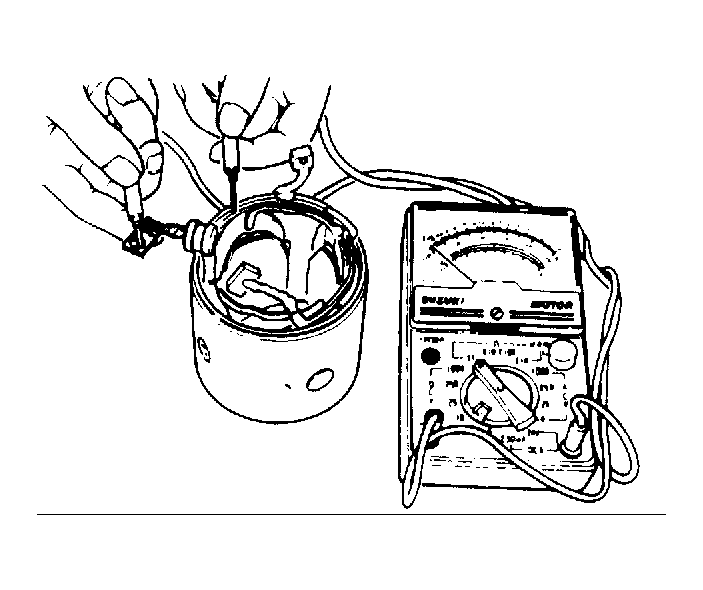 Using a volt/ohmmeter, check for continuity between brush and bare surface. See Fig 5. If there is no continuity, field coil is good. If there is continuity, field coil is bad and must be replaced.