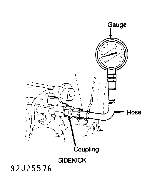 . Attach Pressure Gauge (09912-58441), Hose (09912-58431) and Coupling (09919-46010) at fuel delivery tube. See Fig 1