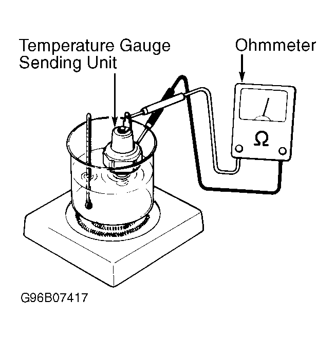 Warm sending unit in water. Ensure resistance decreases with increase of temperature. SeeFig 1 . Using an ohmmeter, check sending unit resistance as temperature changes. See COOLANT TEMPERATURE SENDING UNIT RESISTANCE . If resistance is not as specified, replace coolant temperature sending unit.