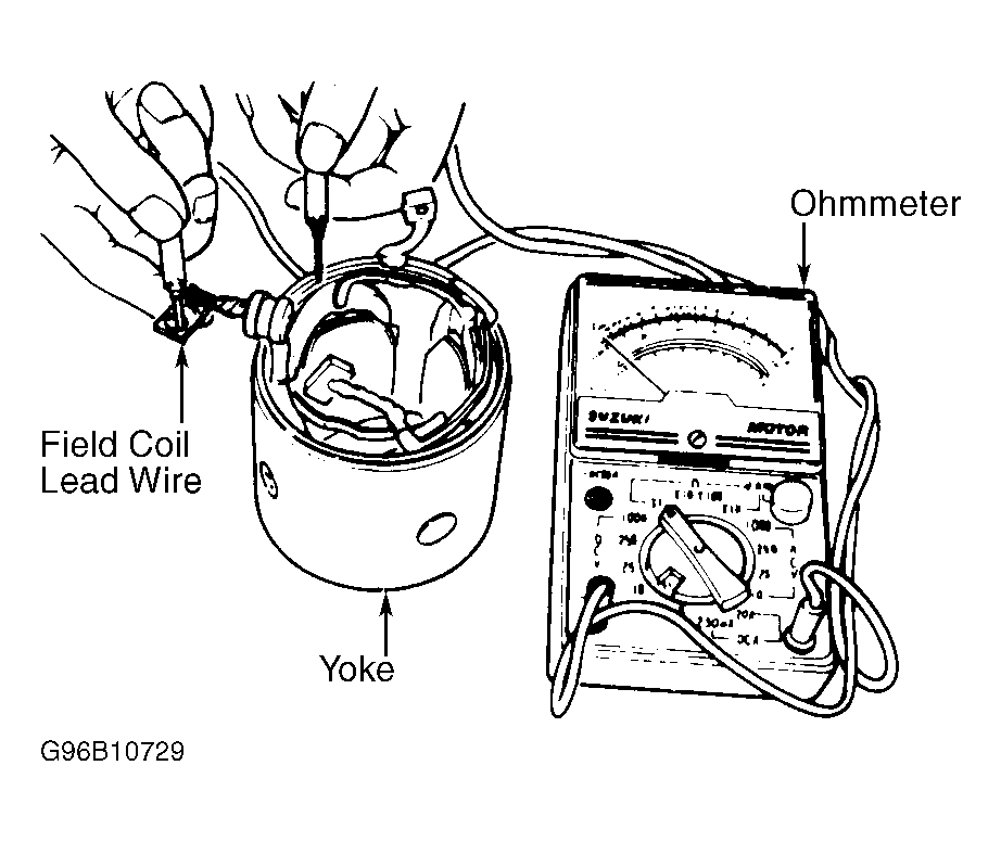 Using ohmmeter, check for continuity between field coil lead wire and bare surface on yoke. See Fig 1 . No continuity should exist. Replace yoke if continuity exists.