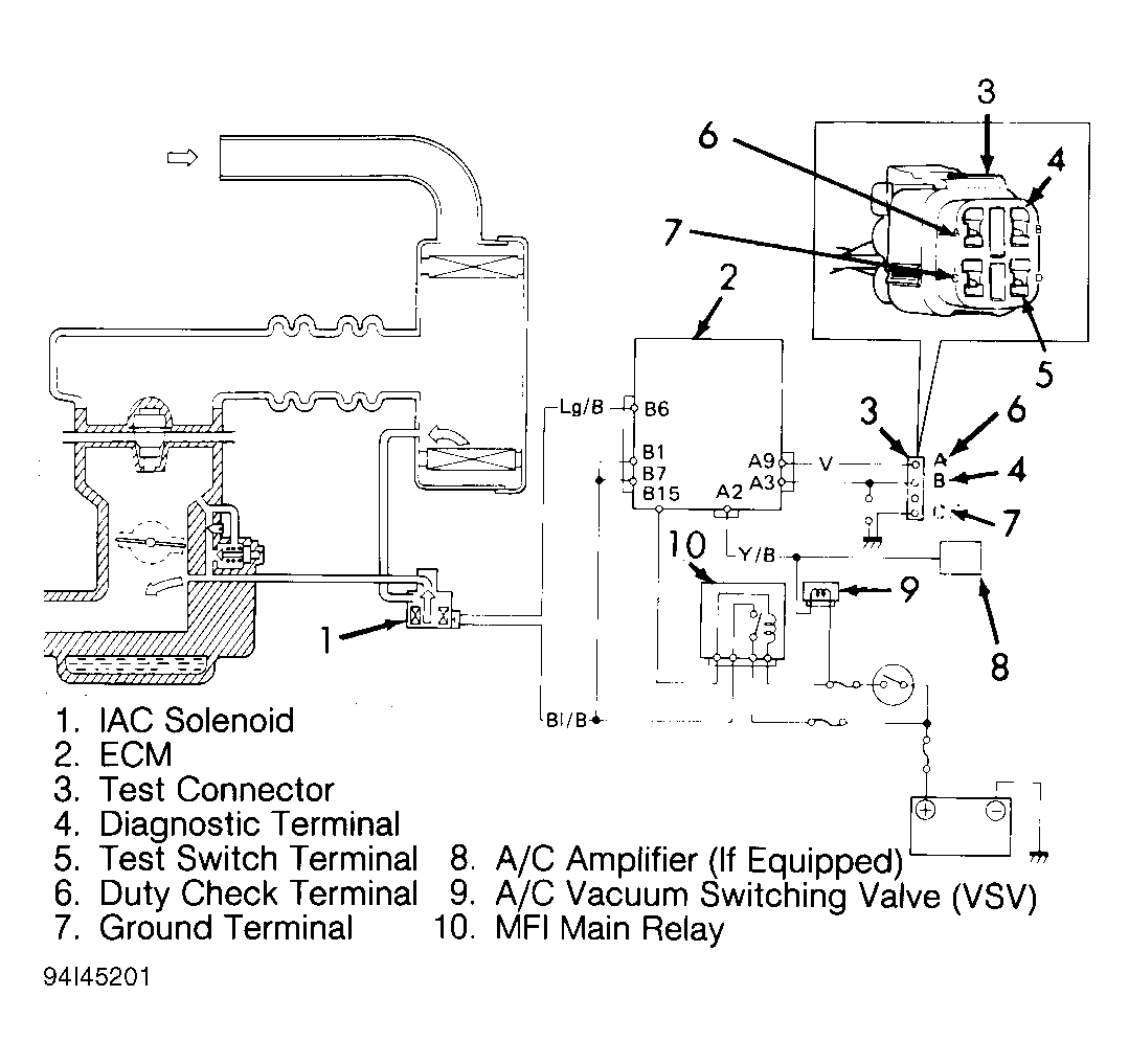 - Check for open in Light Green/Black wire, defective wiring connections or clogged hoses to IAC solenoid. See Fig 1