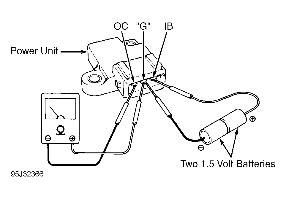 - To test ignitor, turn ignition off. Remove ignitor from under ignition coil. Tape together two 1.5-volt dry cell batteries in series to create a 3-volt power source. Connect a jumper wire from ignitor terminal "G" to negative side of 3-volt power source. Connect another jumper wire from ignitor terminal IB to positive side of 3-volt power source. See Fig 1