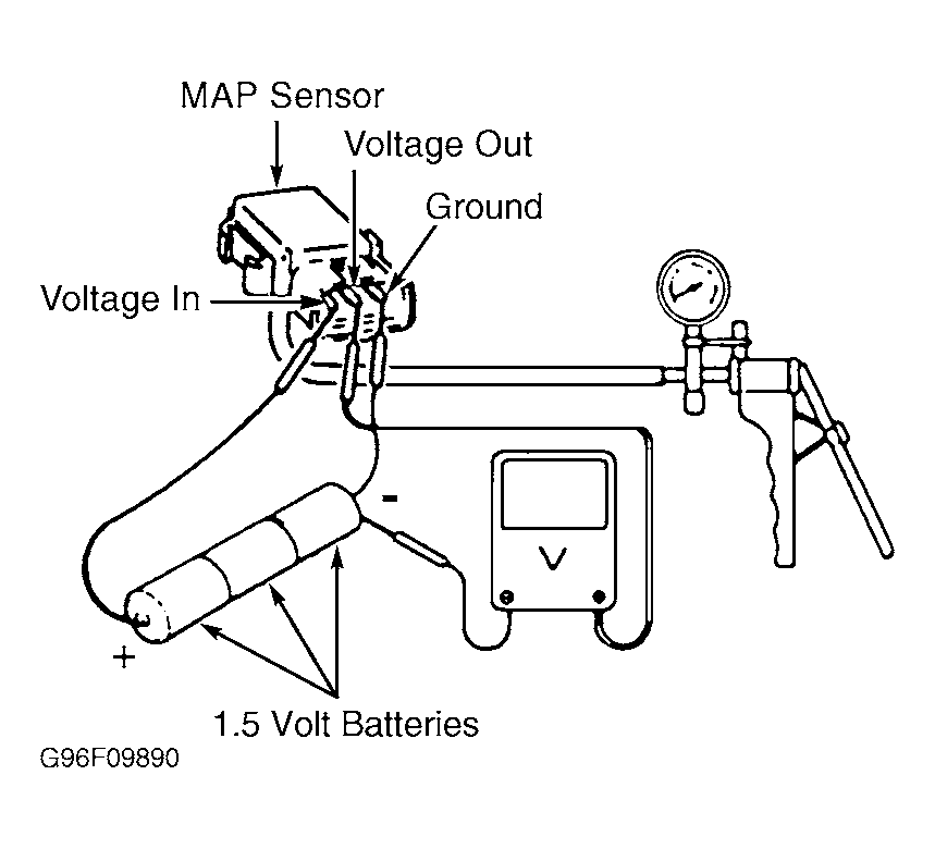 5. Disconnect vacuum hose from MAP sensor. Remove MAP sensor. Connect three 1.5 volt batteries in series. Connect positive terminal of batteries to "Vin" terminal of MAP sensor. See Figure . Connect negative terminal of batteries to "Ground" terminal of MAP sensor. Using a voltmeter, measure voltage between terminals "Vout" and "Ground" of MAP sensor. Ensure voltage is as specified. See MAP SENSOR OUTPUT VOLTAGE table. Ensure voltage decreases as vacuum (up to 15 in. Hg) is supplied to MAP sensor. Replace MAP sensor if voltage is not as specified. If MAP sensor tests okay, replace PCM. Retest system.