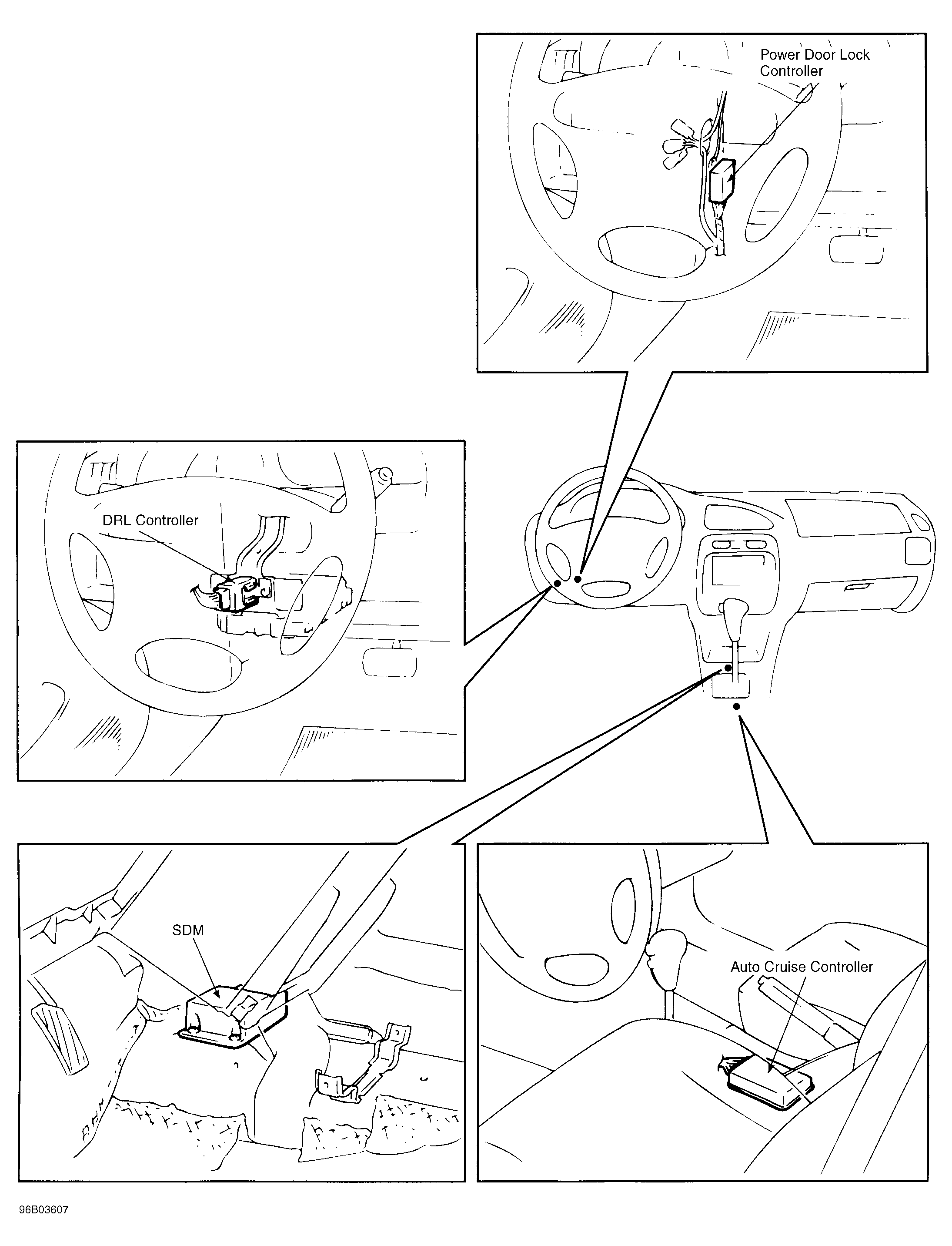 | Power Door Lock Controller | Behind dash, left of steering column. See Figure . |