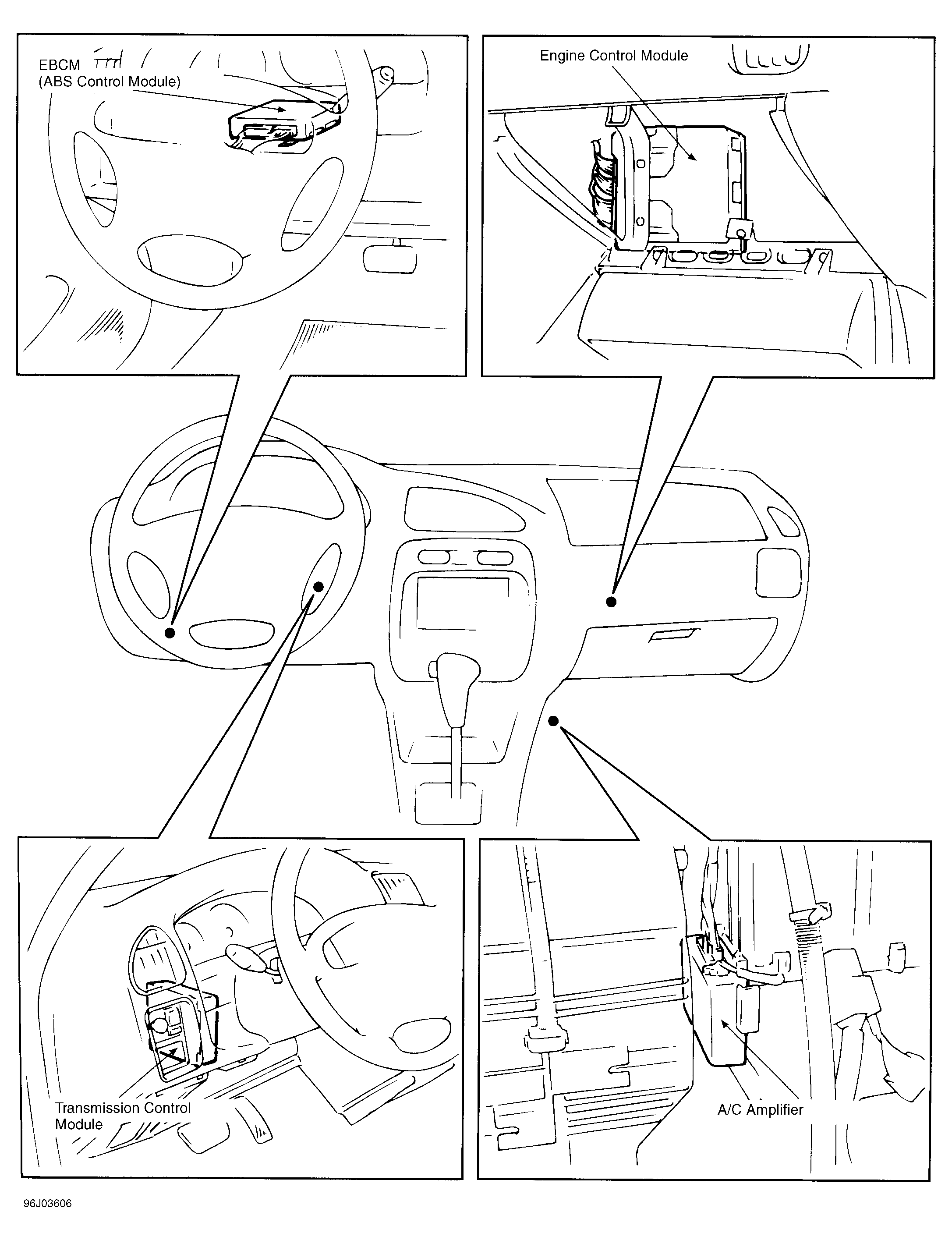 | EBCM (ABS Control Module) | Behind dash, left of steering column. See Figure . |