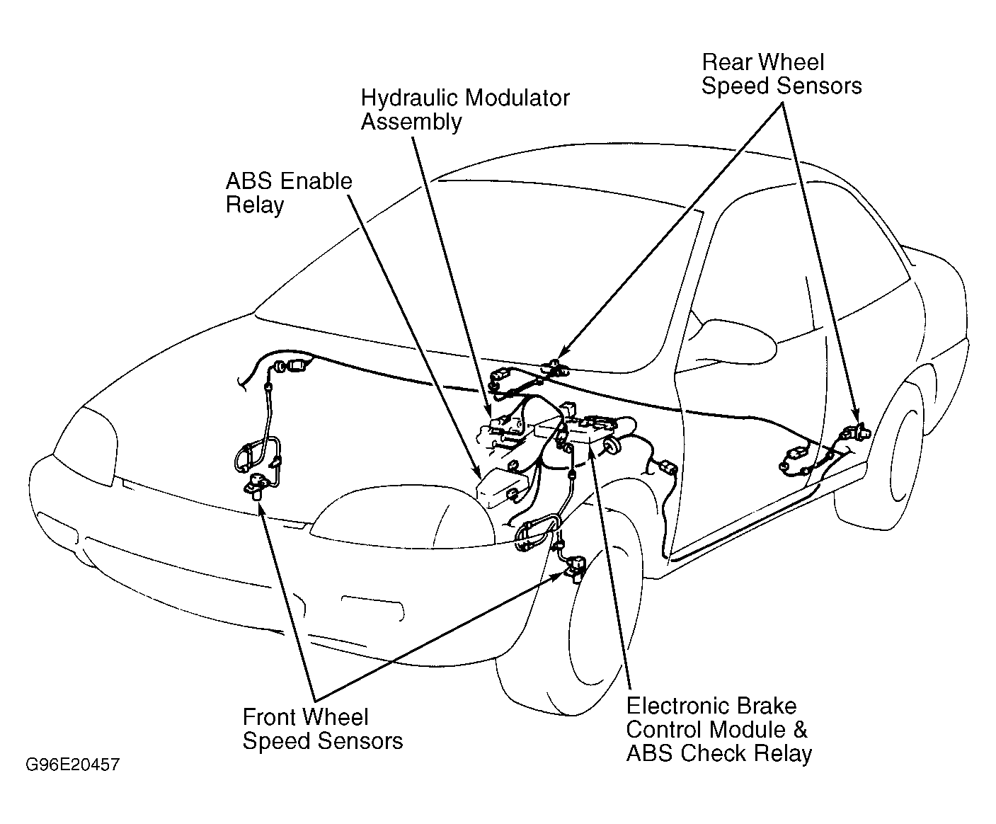 ABS enable relay is a normally-open contact type mounted on right front section of engine compartment, next to hydraulic unit. See Figure. ABS enable relay provides battery voltage to EBCM from 50-amp ABS fusible link, which provides power to motors and solenoids during braking. ABS enable relay is energized when brake switch is closed.