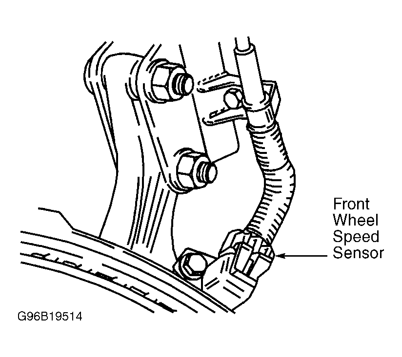 Wheel speed sensor is attached to steering knuckle on front wheels and on rear suspension knuckles on rear wheels, and consists of a sensor and a toothed sensor ring. See Fig 1. Air gap is not adjustable and sensor is not repairable. Front outside drive axle or rear hub and bearing assembly must be replaced if sensor ring is damaged.