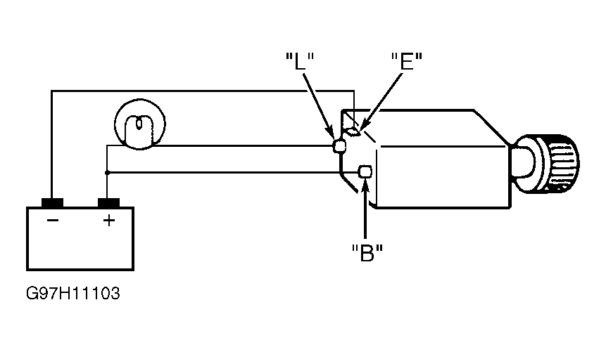 Remove dash illumination controller and disconnect harness connector. Apply positive battery voltage to terminal "B" and negative battery voltage to terminal "E". Connect test light between positive battery voltage and terminal "L". SeeFig 1 . Rotating knob clockwise should brighten test light. Rotating knob counterclockwise should dim test light. If test light does not respond as specified, replace dash illumination switch.
