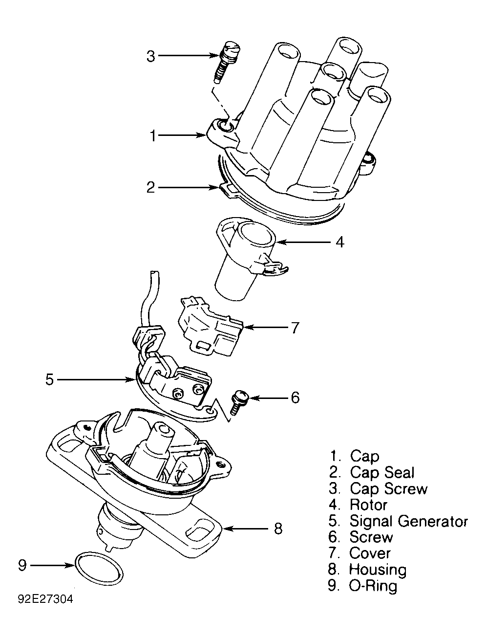Disconnect negative battery cable. Disconnect distributor harness connector. Remove distributor cap. Mark rotor-to-distributor housing and distributor housing-to-engine positions for reinstallation. Remove distributor hold-down bolt and remove distributor. See Fig 1.