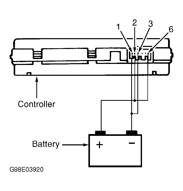 - Disconnect warning controller harness connector E20. Connect negative battery voltage to connector E20, terminals No. 3 and 1 of warning controller. Connect positive battery voltage to connector E20, terminals No. 6 and 2 of warning controller. See Fig 1
