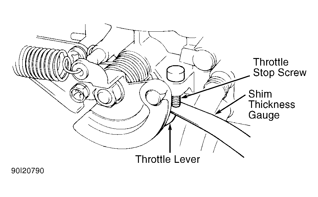 3. With voltage measurement equipment still in place, insert 0.14" (3.5 mm) feeler gauge between throttle stop and throttle lever. See Figure. Ensure ISC plunger is not contacting throttle lever screw. Loosen TP sensor screws and rotate back and forth until 0.98-1.02 volts is obtained. Tighten TP sensor screws to 14-21 INCH lbs. (1.6-2.4 N.m). Replace TP sensor if it cannot be adjusted to specification.