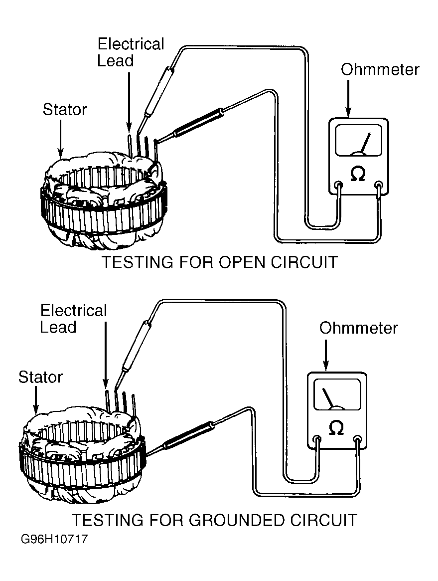 - To test stator for a grounded circuit, use ohmmeter to check for continuity between each electrical lead on the stator and the outside of the stator. See Fig 1