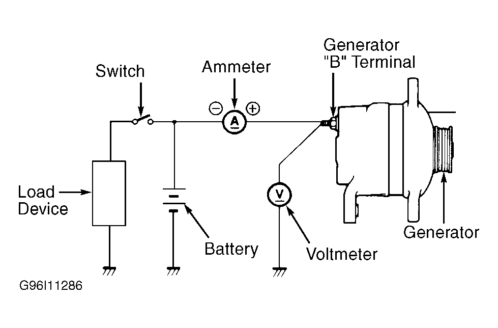 2. Connect voltmeter between ground and generator "B" (battery) terminal. Connect ammeter positive lead to generator "B" (battery) terminal. Connect ammeter negative lead to positive battery terminal on the battery. See Figure .