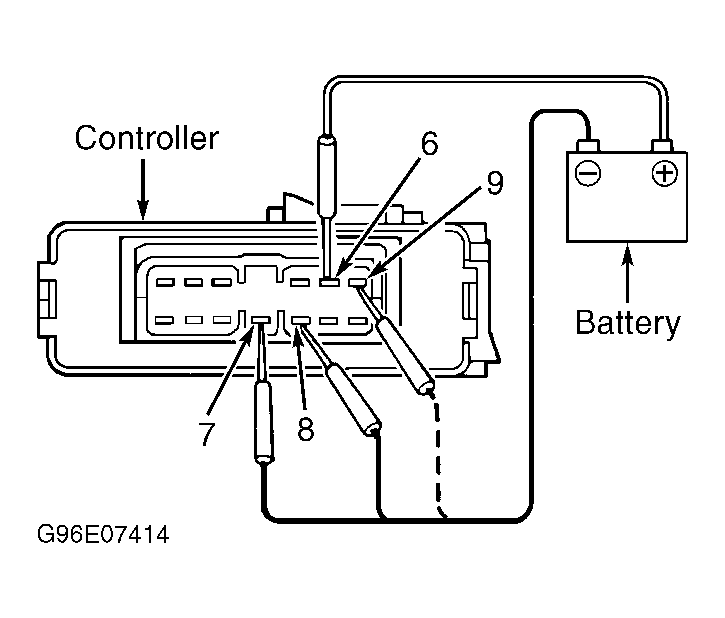 - Disconnect door lock controller harness connector. Door lock controller is located below package tray in luggage compartment. Connect positive battery voltage to power door lock controller terminal No. 6. Connect negative battery voltage to terminals No. 7 and 8. Relay inside controller should click. See Fig 1