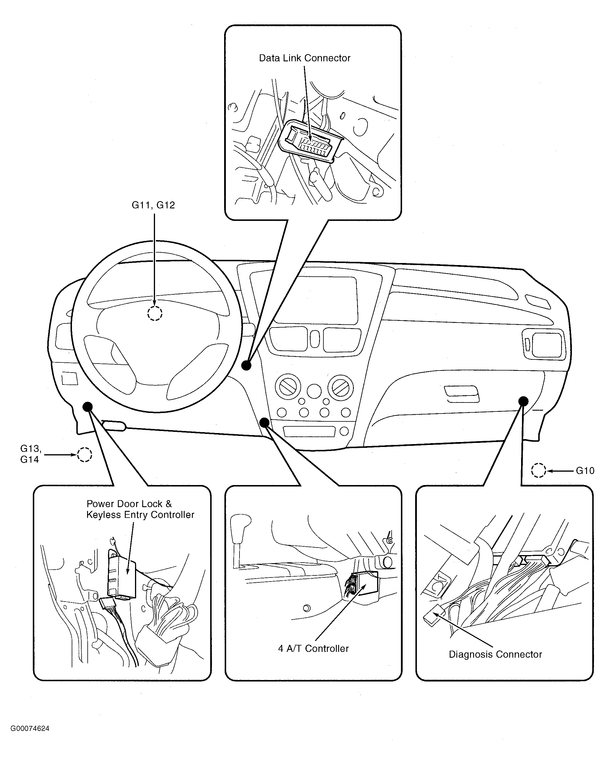 | 4 A/T Controller | Behind left side of dash, left of radio. See Figure . |
