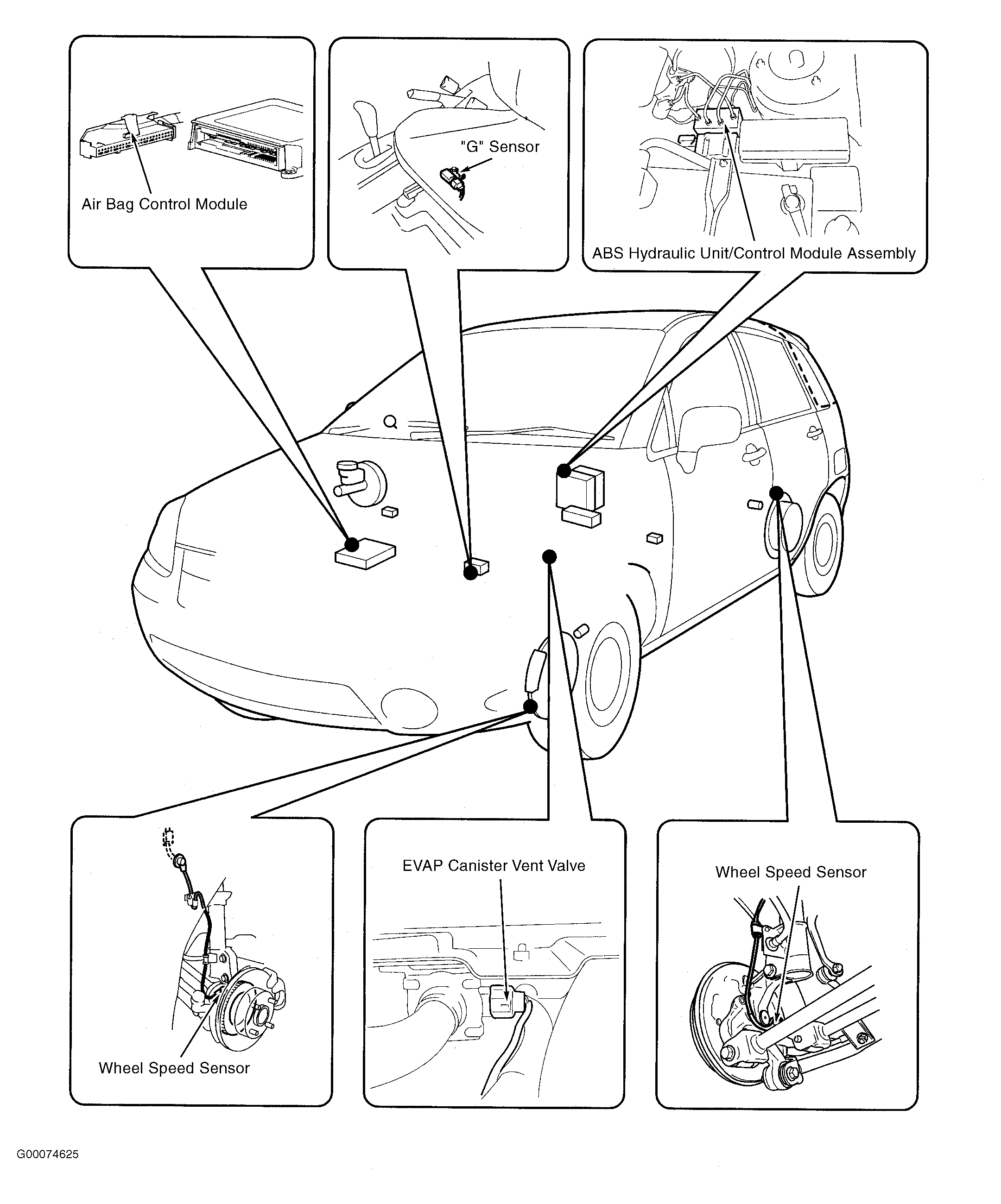 | Air Bag Control Module | Below front console, forward of shift lever. See Figure . |