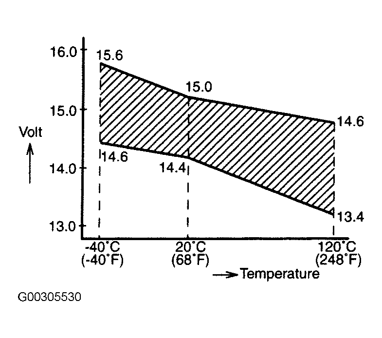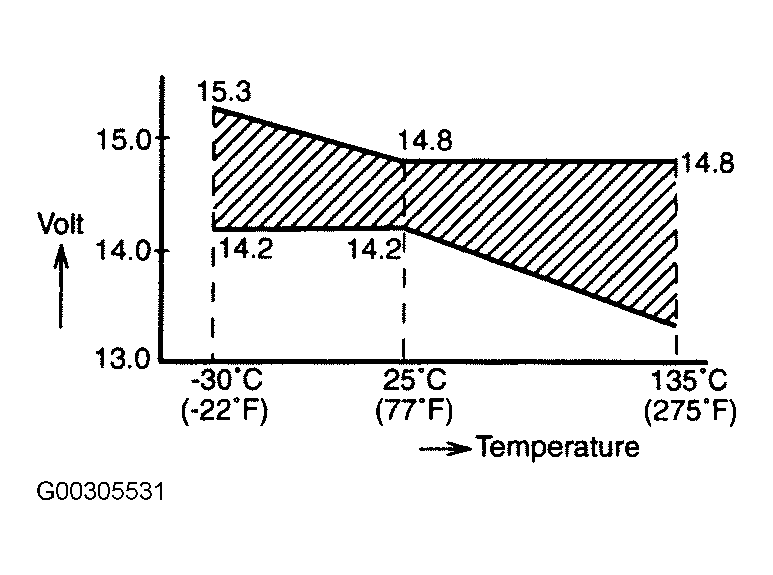 Run engine at idle up to 2000 RPM. Read meters. Amperage should be 10 amps (maximum). Voltage should be 14.4-15.0 volts @ 68°F (20°C) for 60A/70A alternators or 14.2-14.8 volts @ 68°F (20°C) for 80A/105A alternators.