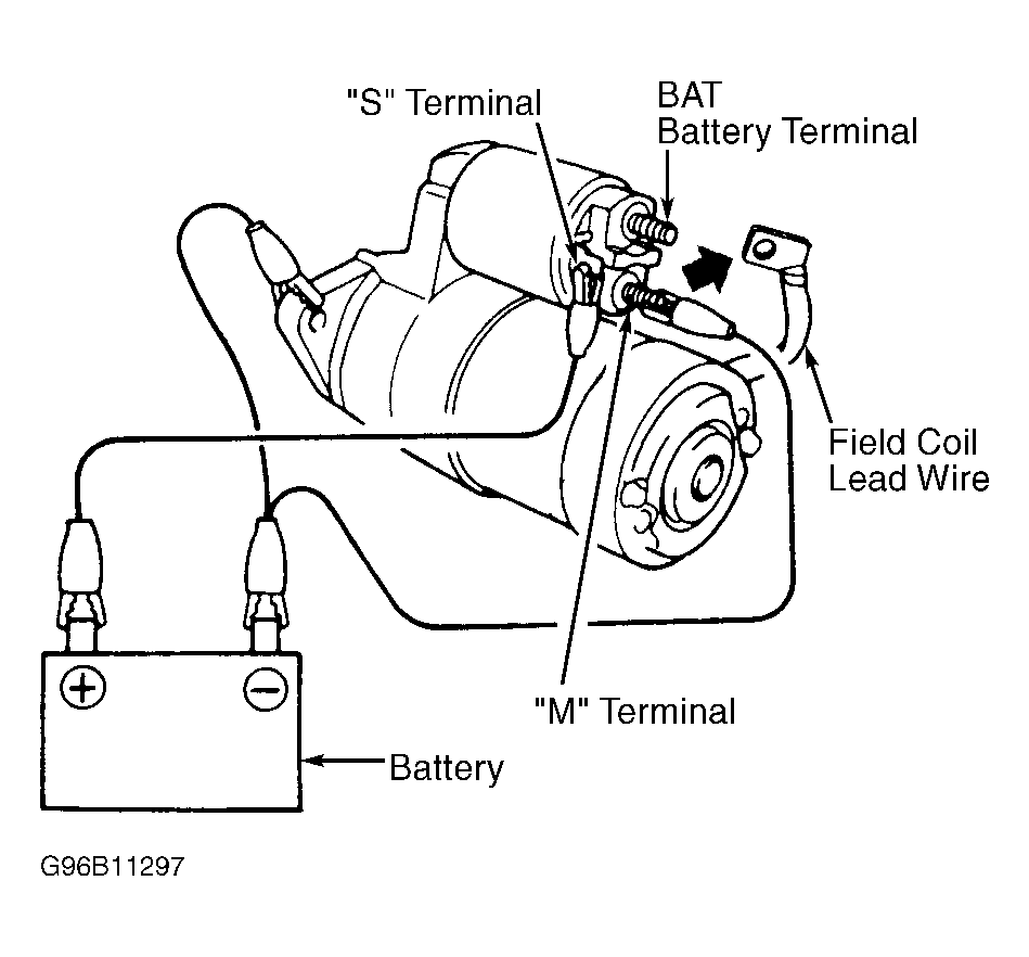 Connect battery to the magnetic switch. See Fig 1 . Check that plunger and pinion move outward. If plunger and pinion don't move, replace the magnetic switch.