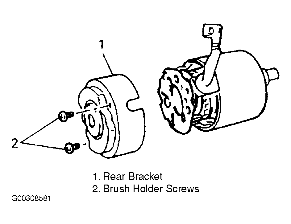 - Install yoke, armature, brush holder and rear bracket to front housing (2) by aligning match marks provided before removal. See Fig 5 .