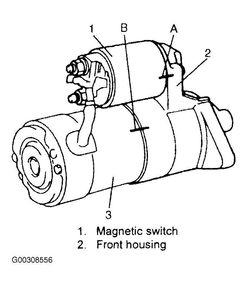 Before disassembling starting motor, be sure to put match marks at two locations (A and B), so that any possible mistake can be avoided. Do not clamp yoke (3) in a vise or strike it with a hammer during repair operations. See Fig 1