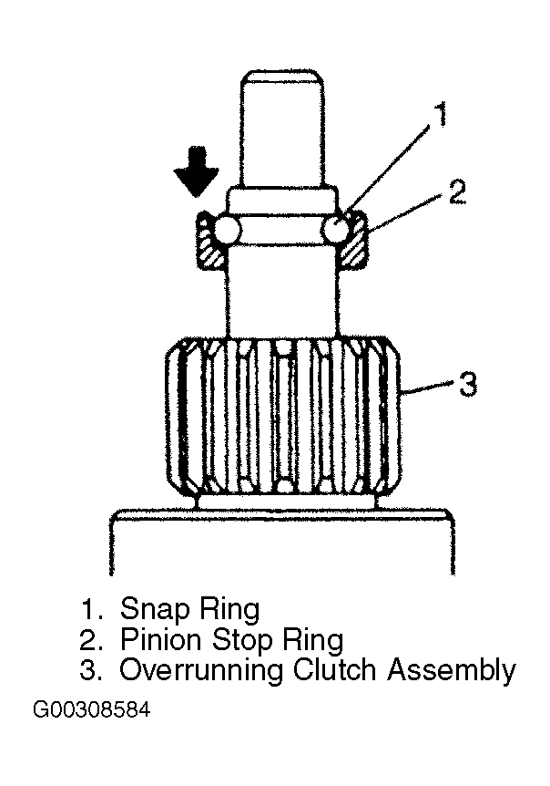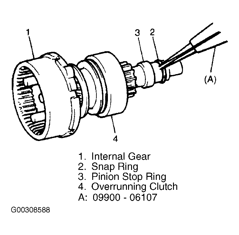 - Remove snap ring (2), and pull out pinion stop ring (3) and overrunning clutch (4) and internal gear (1). See Fig 9 .