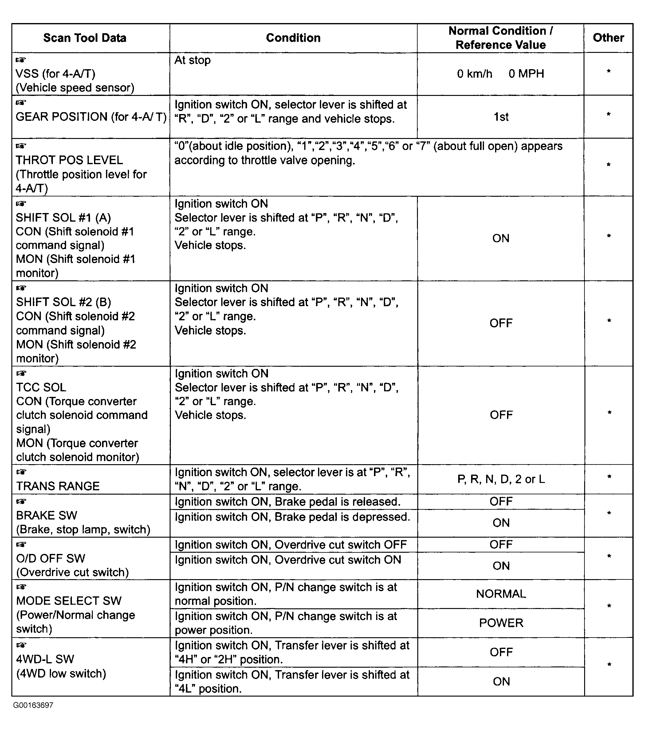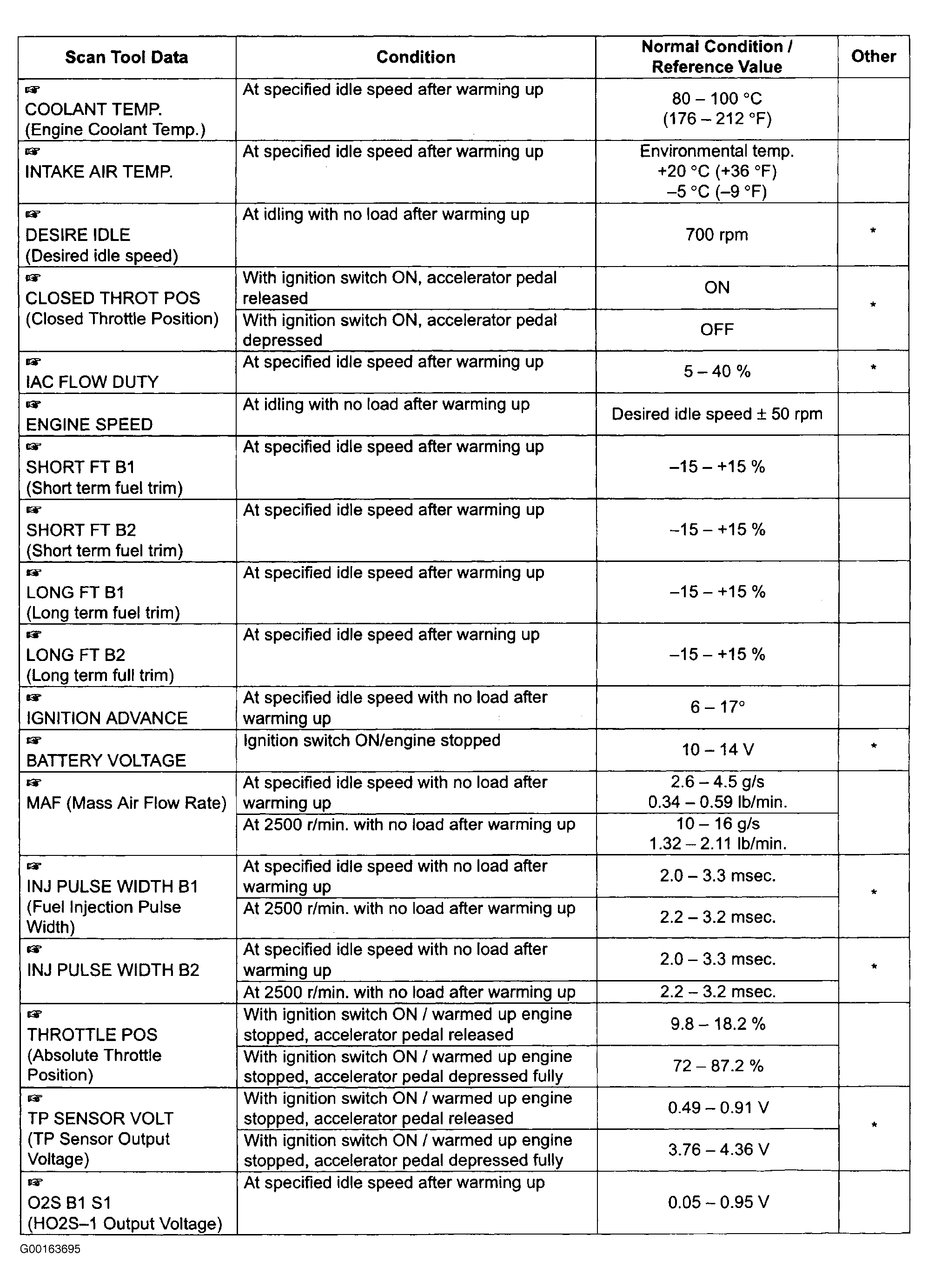 Scan tool data are standard values estimated on the basis of values obtained from normally operating vehicles by using scan tool, use data as reference values. See Fig 1 - Fig 3 . Even when vehicle is in good condition, there may be cases where the checked value does not fall within each specified data range. Judging a component as bad, should not be made by checking with this data alone. Conditions that can be checked by the scan tool are those detected by ECM, along with ECM inputs and output commands. There may be cases where engine or actuator is not operating as indicated by scan tool. With OBD-11 generic scan tool, only star marked data can be read. Be sure to use timing light to check ignition timing. When checking scan tool data with engine running at idle or racing, be sure to shift M/T gear to Neutral position and A/T gear to Park position. Engage parking brake fully. If nothing or "no load" is indicated, turn OFF A/C, all electric loads, P/S and all other necessary switches before testing.