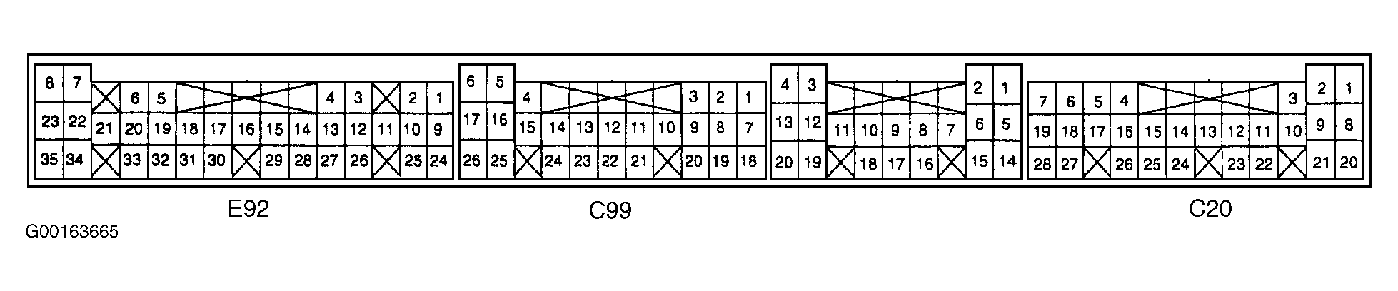 Measure Between ECM Harness Connector Terminals Wire Color C20/20 & E92/8 Blue/Red C20/8 & E92/8 Blue/Yellow C20/1 & E92/8 Blue/White C20/2 & E92/8 Blue/Black - Check for short to each other in fuel injector circuits. See WIRING DIAGRAMS article. If problem is found, repair as necessary. After repair, retest system. If no problem is found, go to next step.