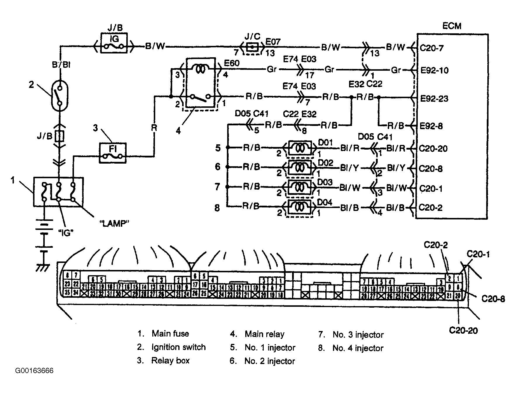 - Turn ignition on. Using test light connected to ground, probe fuel injector harness connector terminal No. 2 (Red/Black wire), at each injector. If test light illuminates, go to next step. If test light does not illuminate, check for open or short in Red/Black wire between fuel injector and main relay. See Fig 1 or Fig 2 . If problem is found, repair as necessary. After repair, retest system.