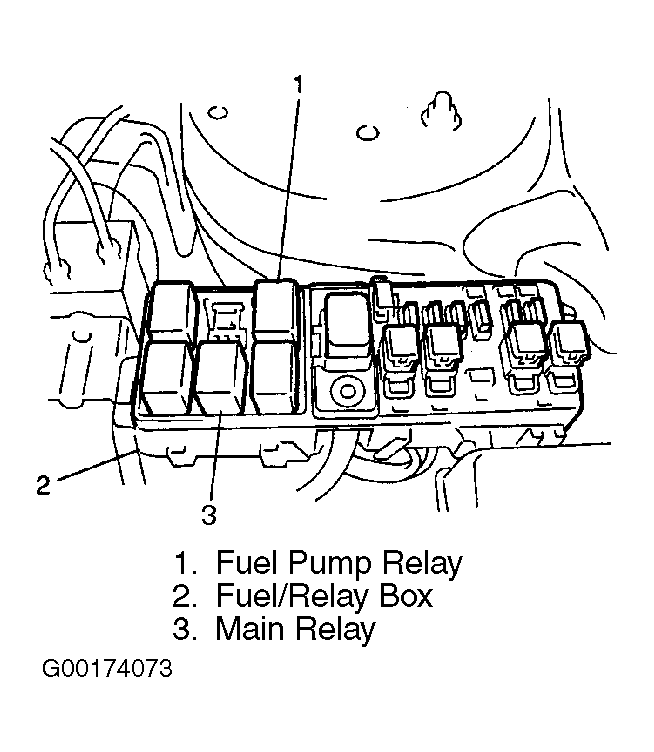 - Turn ignition off. Remove fuel pump relay from underhood fuse/relay box. See Figure . Check for poor, loose, corroded or damage to main relay socket connections. If problem is found, repair as necessary. If no problem is found, go to next step.